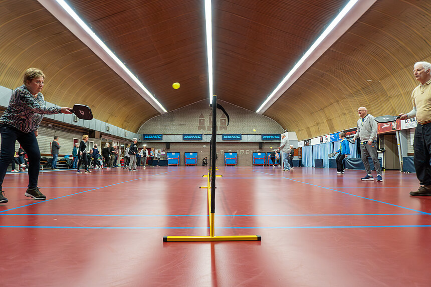 Een van de vrijwilligers van het proefpotje is de 78-jarige Ine. Aan fanatisme geen gebrek bij haar, want tijdens het potje probeert ze al een paar keer haar tegenstander de andere kant op te sturen met geplaatste ballen. "Ik heb vroeger getennist, dus balgevoel is me niet vreemd. En ik vind het leuk dat je steeds je gedachten erbij moet houden door de regels. Dat vind ik fijn. Ik ga hier zeker een keer kijken op zaterdag."